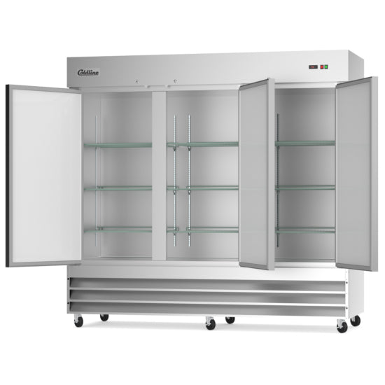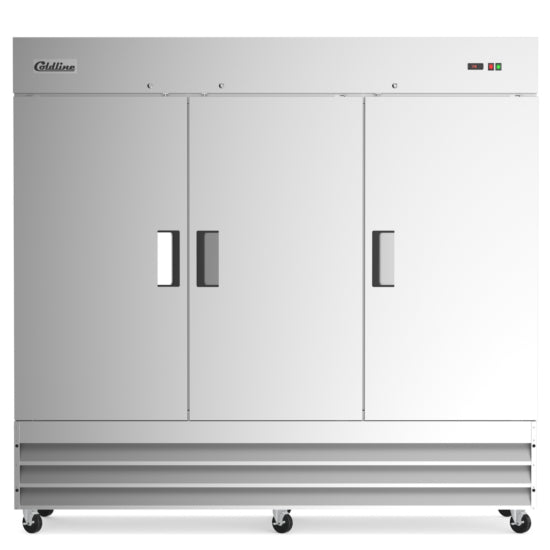 This triple door reach-in freezer with 66.5 cu. ft. capacity features a heavy-duty stainless steel interior and exterior ensuring many years of dependability in even the most difficult commercial settings. Insulated self-closing lockable doors allow Coldline reach in models to hold safe temperatures in the hottest kitchens. Included 9 wire shelves with a versatile shelf slide design. Fits full-size hotel pans in either orientation. Lockable heavy-duty wheels come standard. This unit uses HYDRO-CARBON R290 refrigerant, which is environmentally friendly and more efficient than R134a/R404a refrigerant.